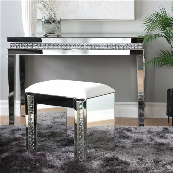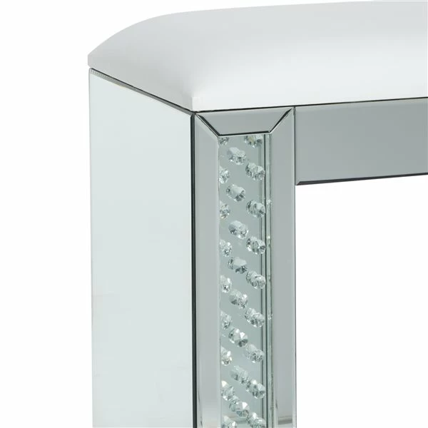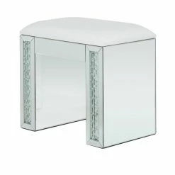 - A wood and glass accent stool featuring white seat cushion and mirrored base with crystal bead embellishments