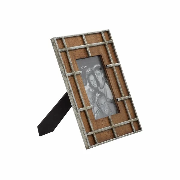 - The metal moulding and inlays of this photo frame have a modern distressed silver finish