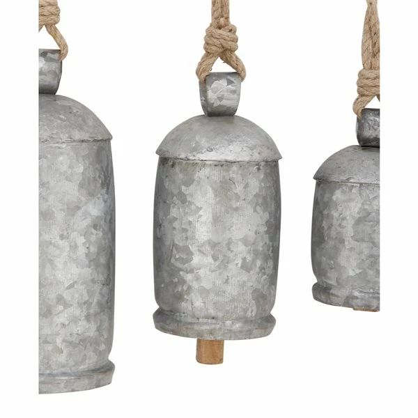 - Features 3 metal cowbells in different sizes, designed with mango wood clappers and brown jute rope hangers