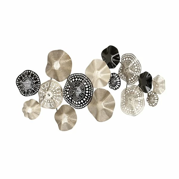 - Abstract collage wall art of round, crumpled, and latticed metal patterns