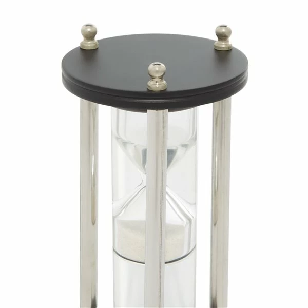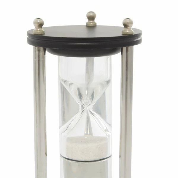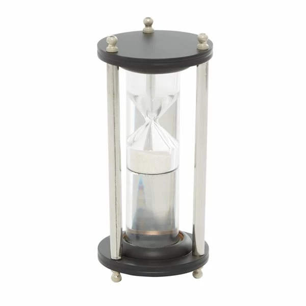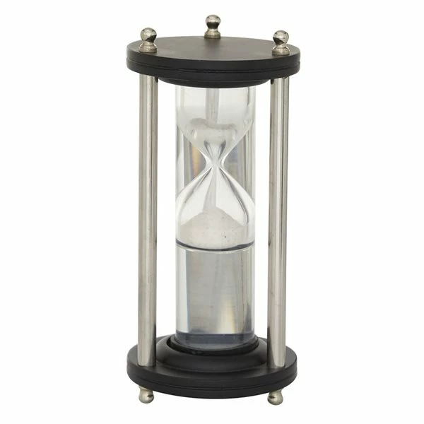 - Aluminum frame with a rounded base and top, clear tube contains water and small hourglass
