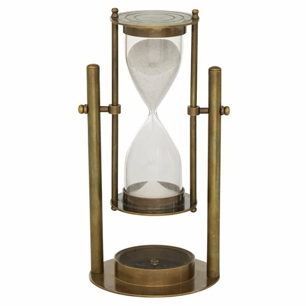 - This interactive brass hourglass timer showcases a rotating hourglass stand feature and a built-in compass design at the bottom of its base