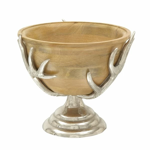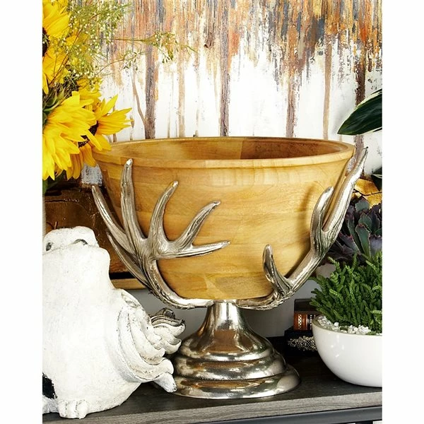- Natural brown wood bowl finish and metallic silver antler stand finish