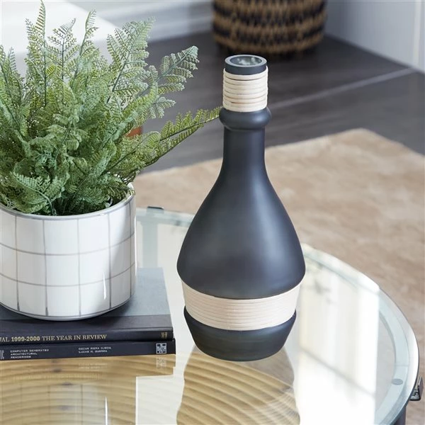 - Trumpet-shaped jar vase with raffia ribbon accents