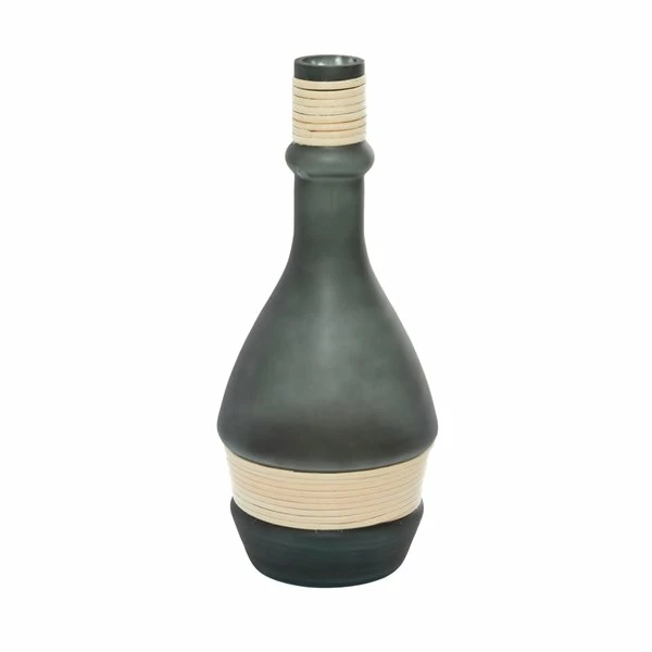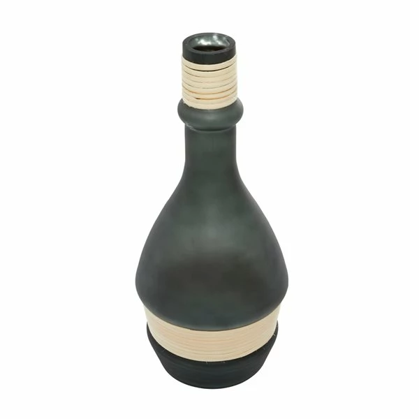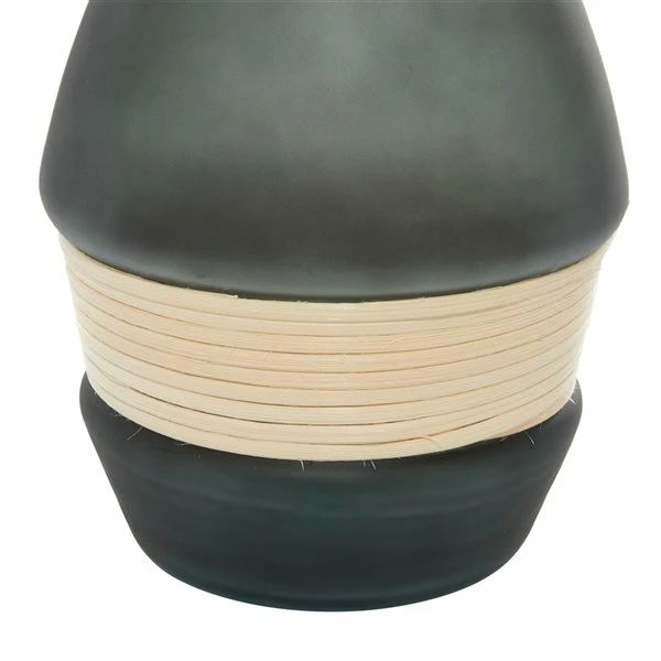 - It has an olive-green matte glass finish with a light beige raffia palm ribbon accent