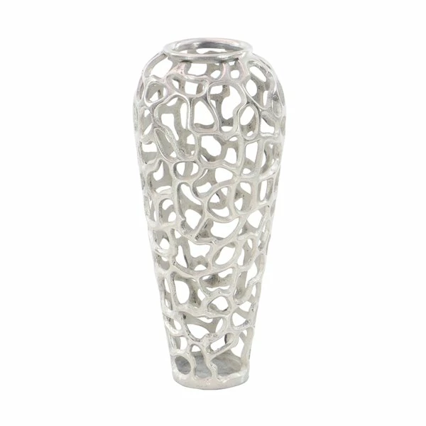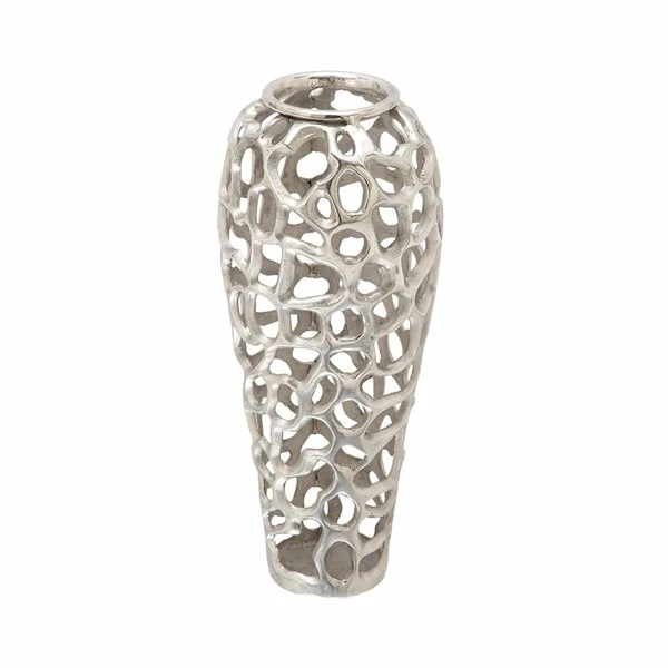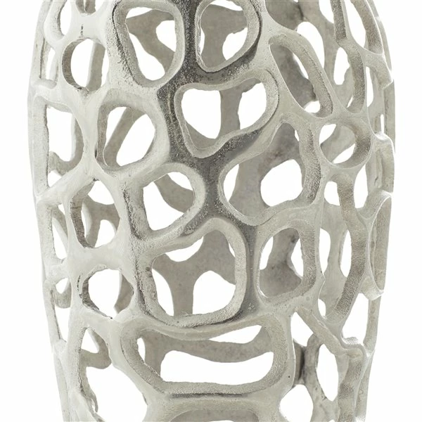 - Silver vase with delicate interlacing lattice work that creates an elegant mesh