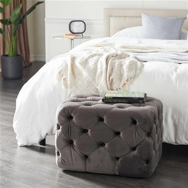 - Tufted velvet ottoman with foam cushion and MDF base