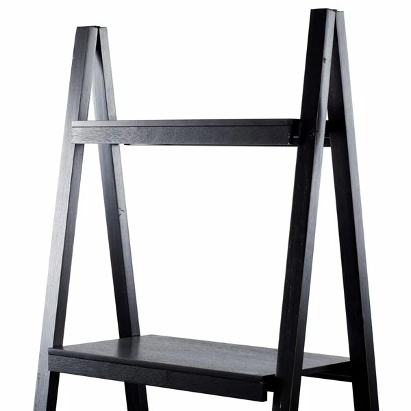 - Black frame and wooden shelves in varying sizes