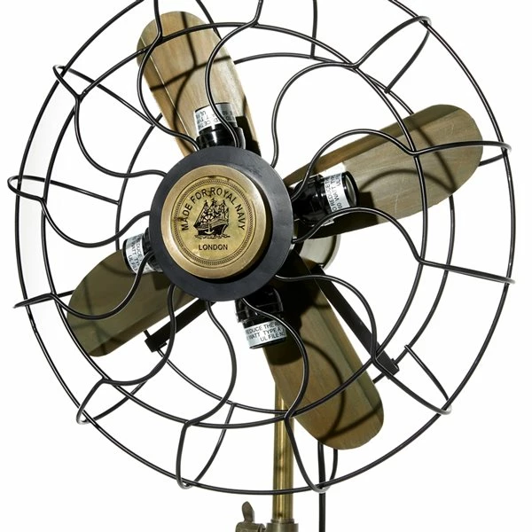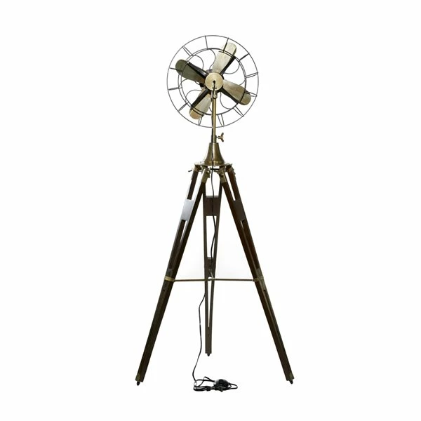 - The floor lamp carries an antique-inspired industrial fan with tripod legs