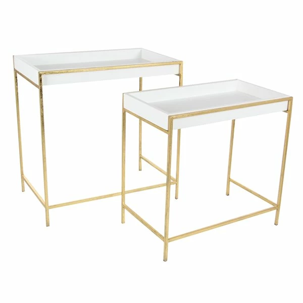 - Console tables feature opulent white base trays with slender gold frames