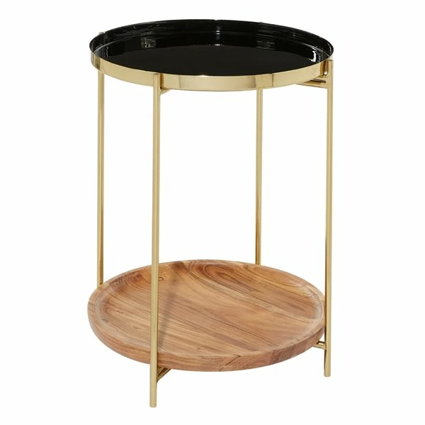 - Features a round metal tray top with high-shine gold lacquered finish