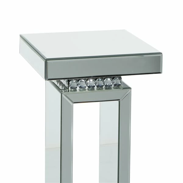 - A wood and glass accent furniture featuring a pedestal-style table with reflective glass panels, round bead details, and rubber stoppers at the base