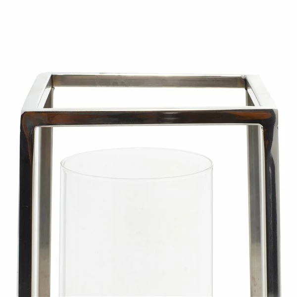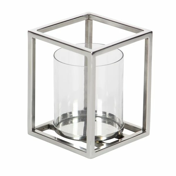 - Features a clear cylindrical glass with stainless steel plate comes with a stainless steel open rectangular frame in silver finish
