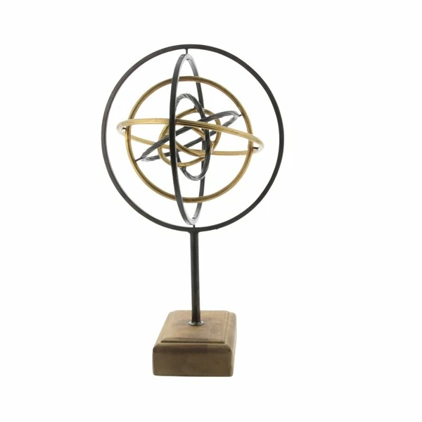 - Black and gold metal orbs intertwined to create a dimensional geometric sculpture on a rectangular, light brown natural wood base
