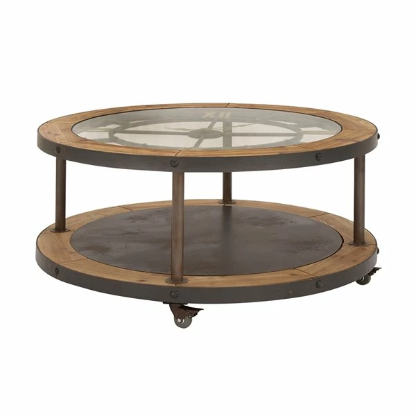 - This industrial coffee table is crafted with MDF, metal, and glass material