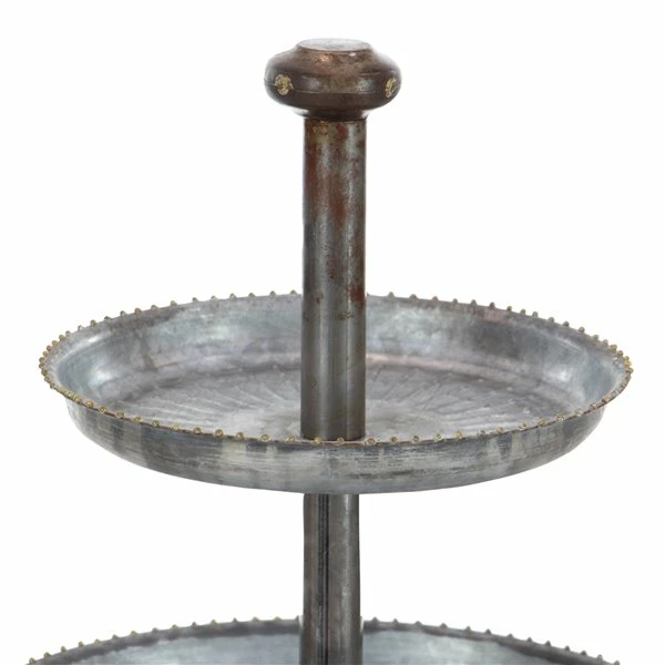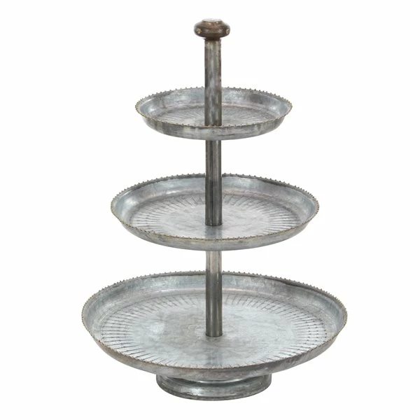 - This 3-tier tray stand brings farmhouse flair with a galvanized metal finish, linear grooves, and metal bead detail