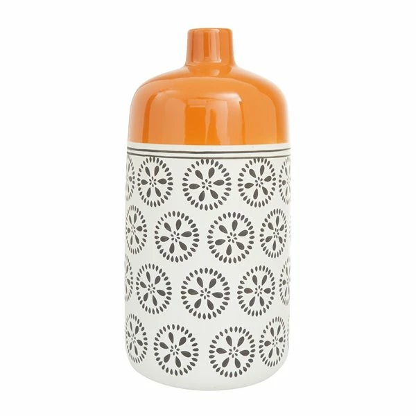 This splendid white ceramic vase features floral patterns and a bold orange accent on the neck.