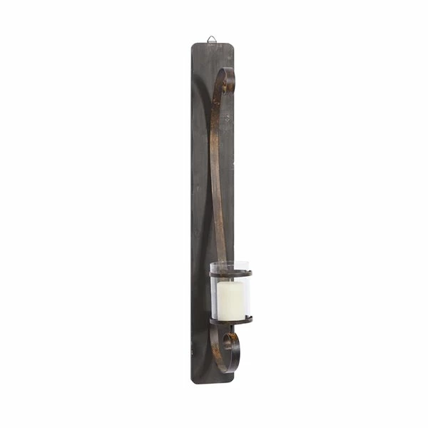 | Manufacturer Color/finish | A long, rectangular dark brown metal panel with a distressed scroll sculpture with a metal candle plate holding a clear hurricane glass candle cover |