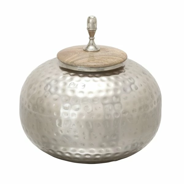 This contemporary silver iron jar with a wooden lid will make a nice corner display in your living room.