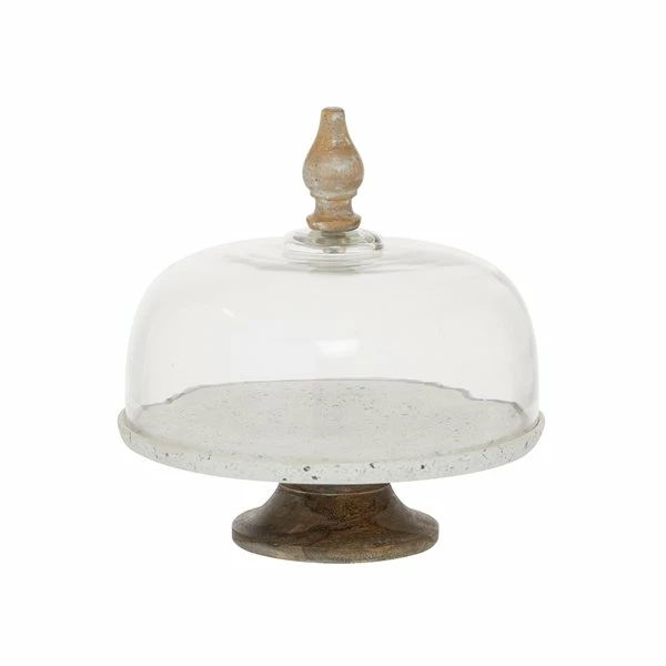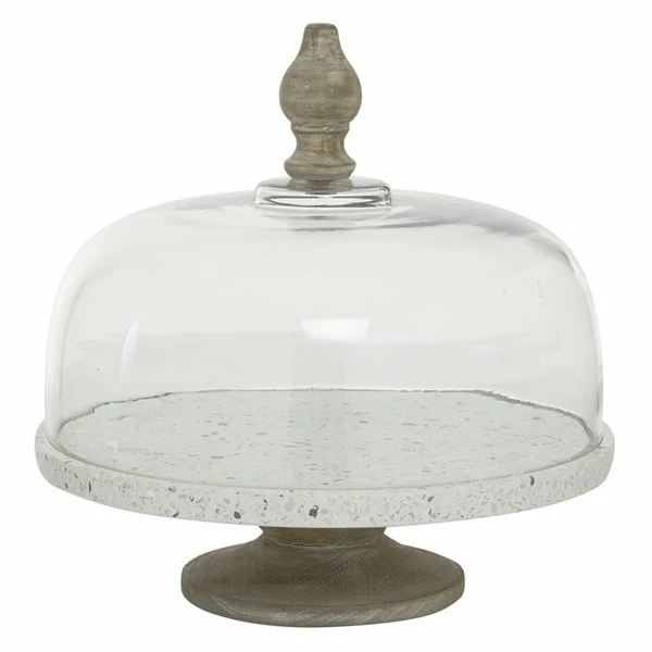 - This contemporary style inspired white glass and terrazzo cloche features a round wood pedestal base complemented with a dome-shaped glass lid with a carved wood handle on top