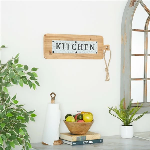 - Wooden kitchen wall sign with chopping board-inspired design with a metal plaque and a jute rope handle