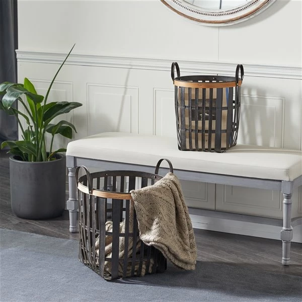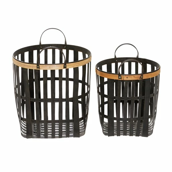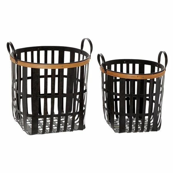 - Each coal black storage basket features a grid mesh pattern with riveted wood accent details