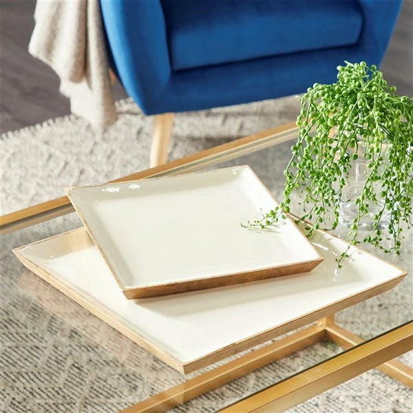 - Each decorative tray features a glossy and smooth enamel top finish with wood outline edges to finish the elegant design