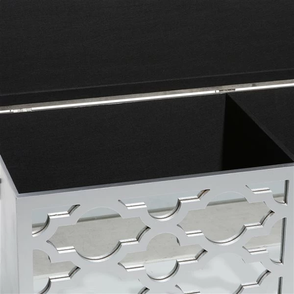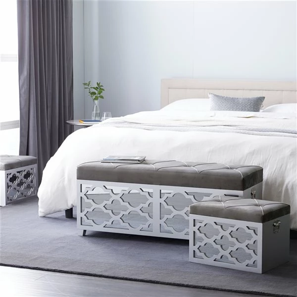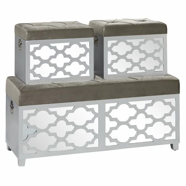 - With a convenient hinge hardware and velvet tufted seat top opens into storage with 2 smaller chests