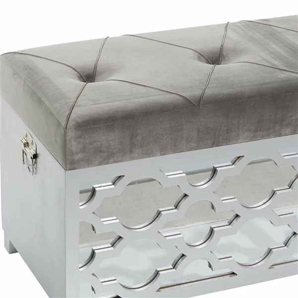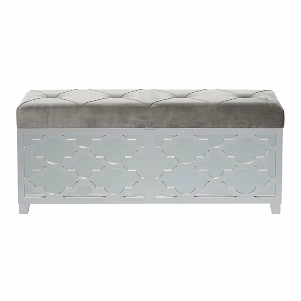 - Features a solid grey wooden finish, a dark grey-cushioned velvet seat, and a reflective mirror finish