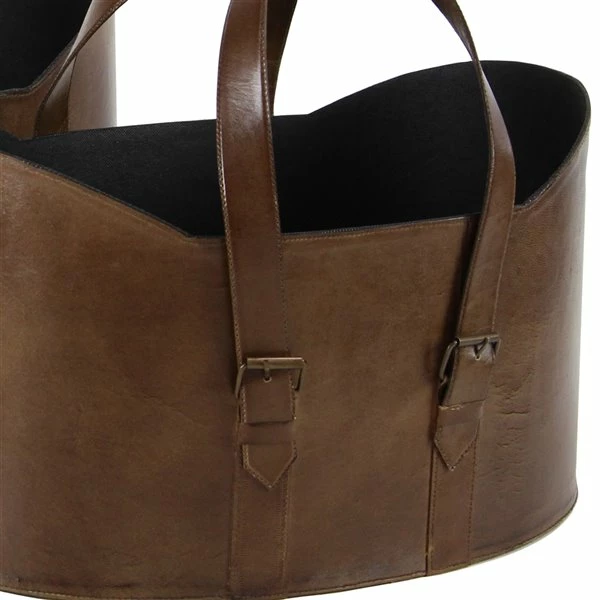 - These leather magazine racks feature oval receptacles, angled rims, and strap handles with buckles