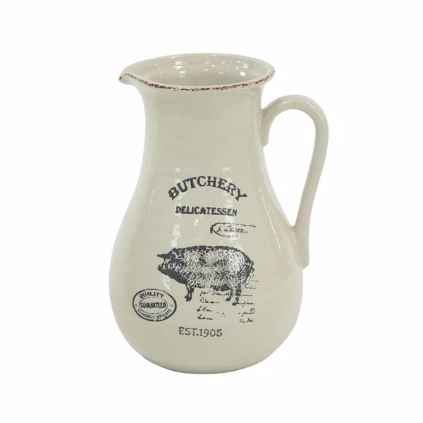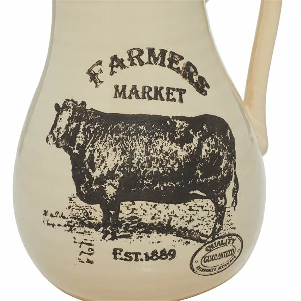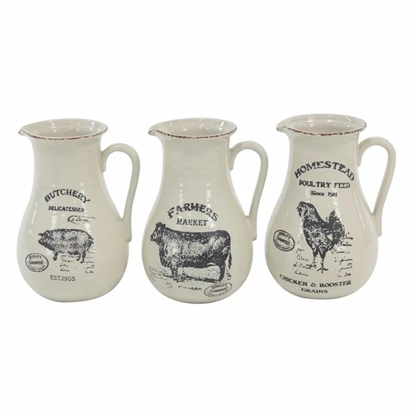 - Oinochoe-style vases with vintage-stamped farmhouse texts and illustrations