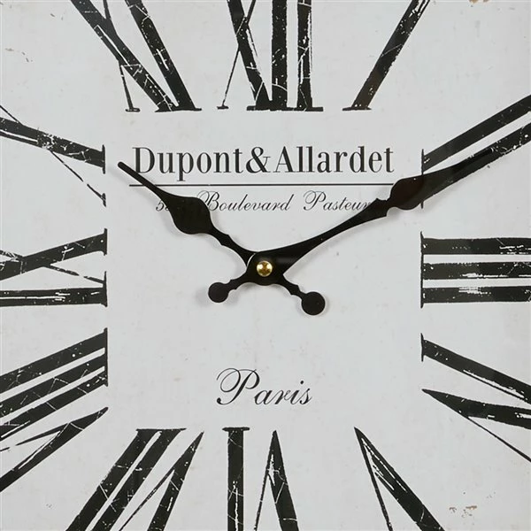 - Black housing, distressed clock face with black Roman numerals and elegant script