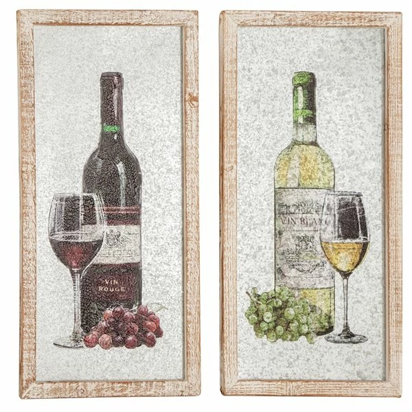 - Features two galvanized-looking rectangle panels printed with red and wine wines and enclosed inside whitewashed brown frames
