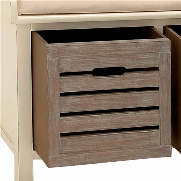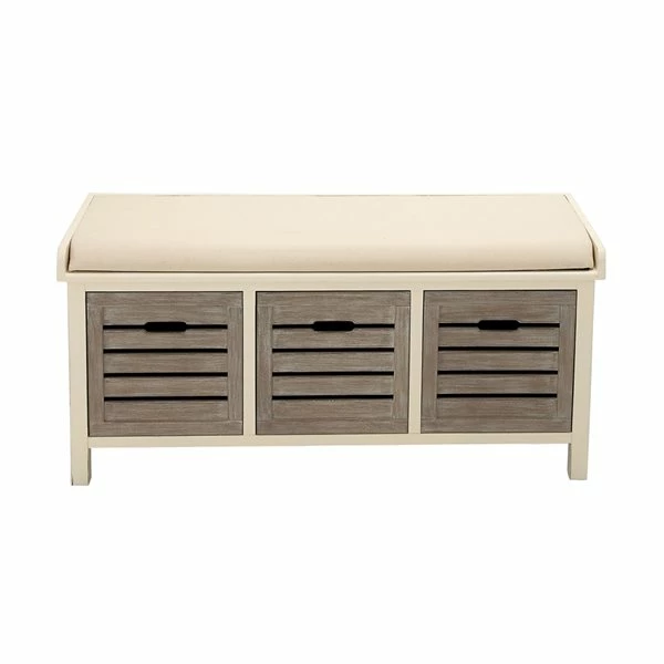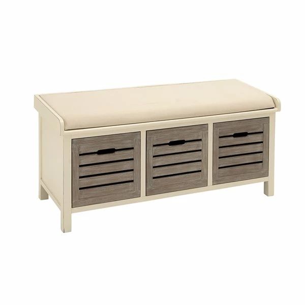- This mudroom bench with shoe storage and cushion has a creamy-white rectangular frame housing 3 pull-out drawers