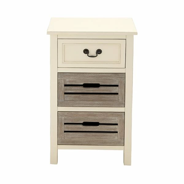 - Features 1 slide-out drawer with a metal pull handle and 2 shelves with wooden crates