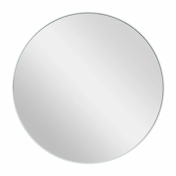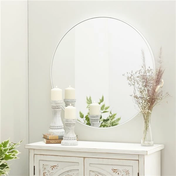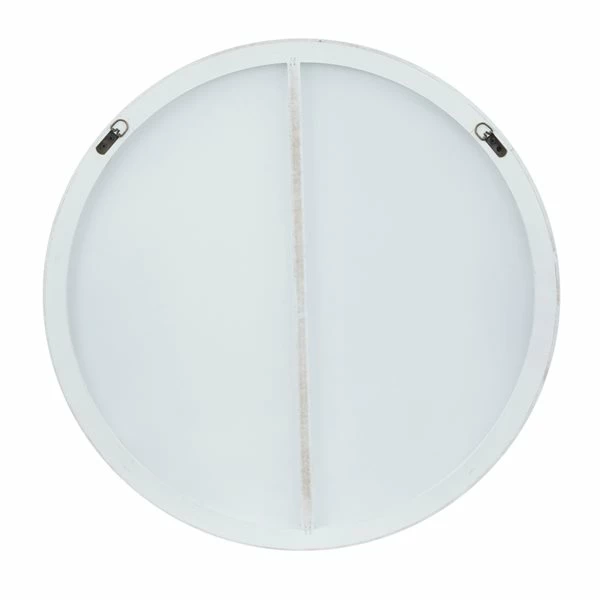 - Features a round-shaped reflective glass and a thin white wooden frame