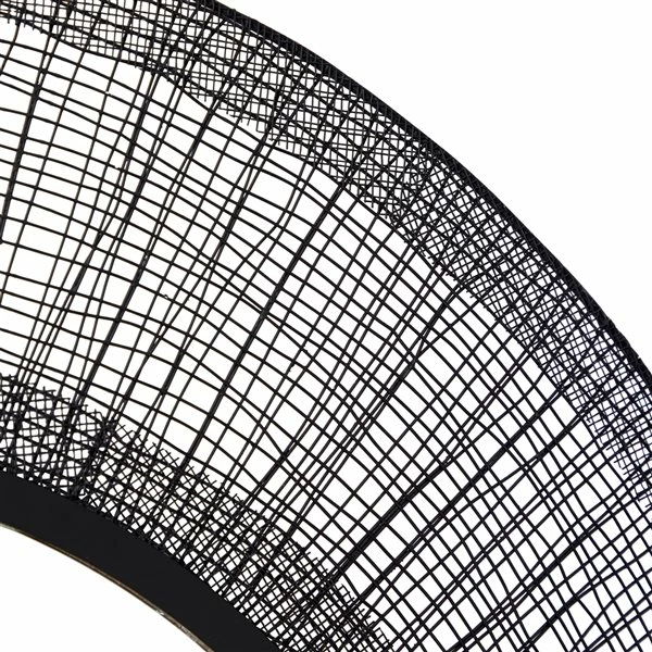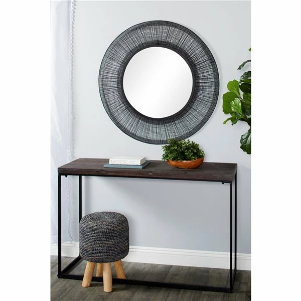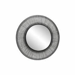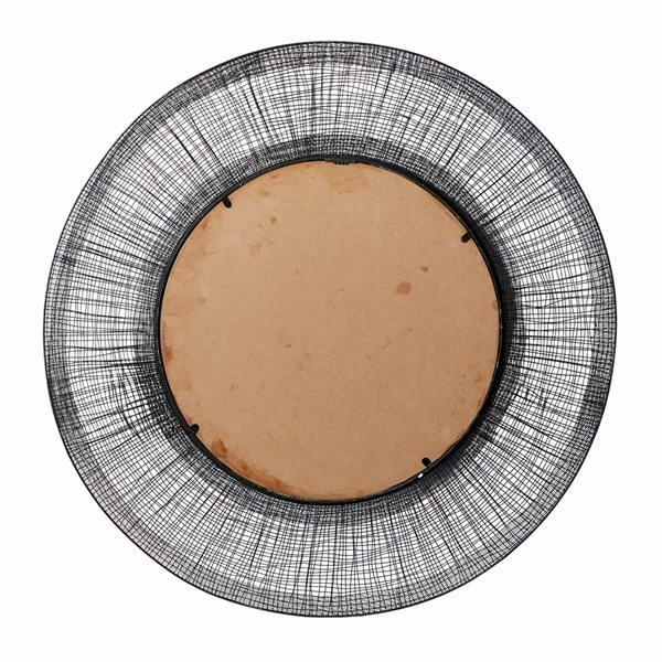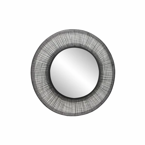 - Decorative mirror with a black metal crosshatched frame creating a linen-like dimensional texture