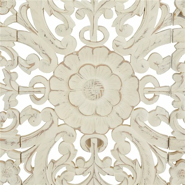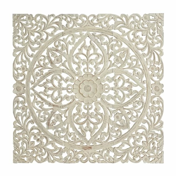 - This 3 panel medallion wall decor highlights a faintly distressed beige finish that enhances textured look