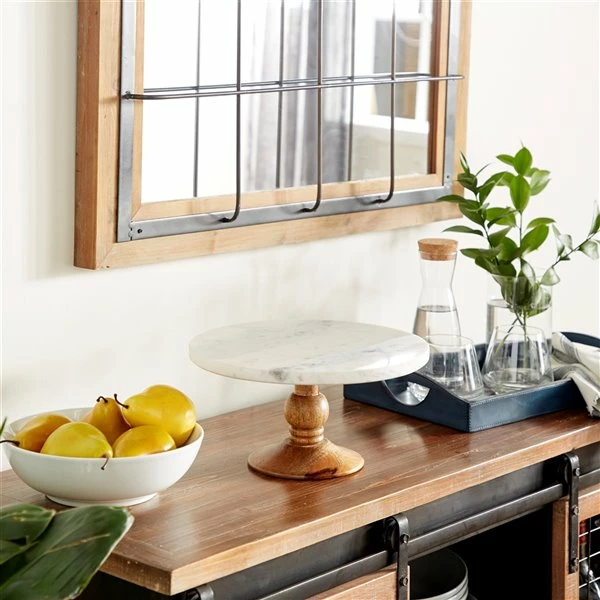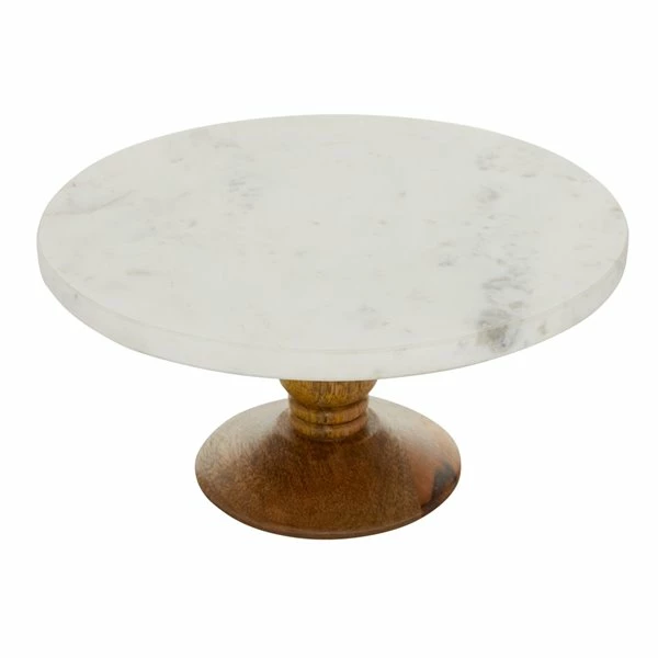 - This wood and marble cake stand features wide display with a sturdy pedestal wood base