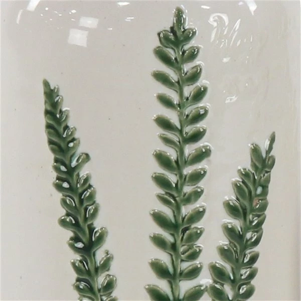 - A set of bottle-shaped stoneware vases with lacquered white finish, round openings, and embossed leaf details