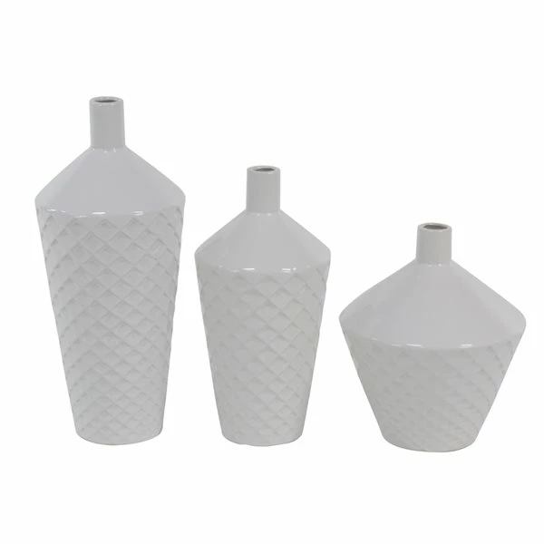 - This set of bottle vases have an identical criss cross-patterned design in small, medium and large sizes