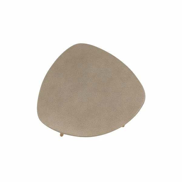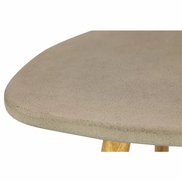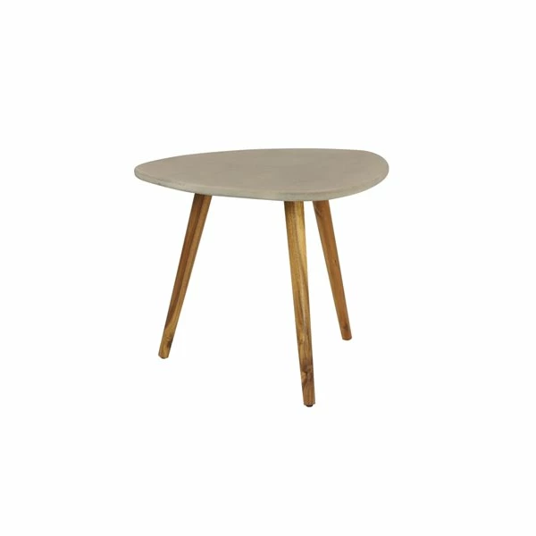 - This light grey faux cement outdoor table carries a matte finish on its triangle tabletop and polished brown wood on its legs