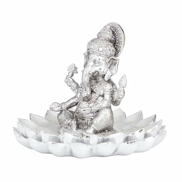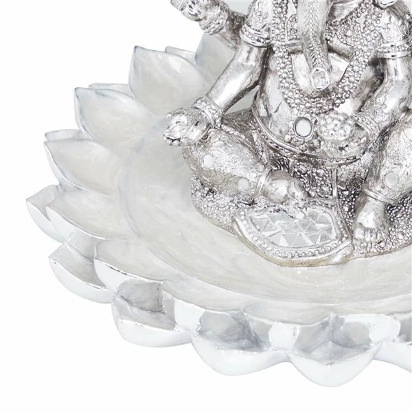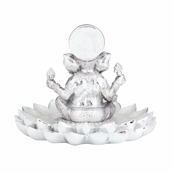 - This table and desk decor has a Lord Ganesh sculpture sitting on a double-petal lotus flower