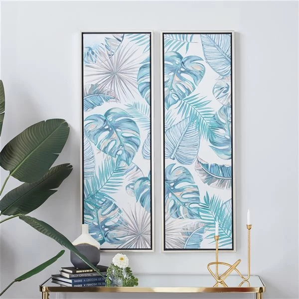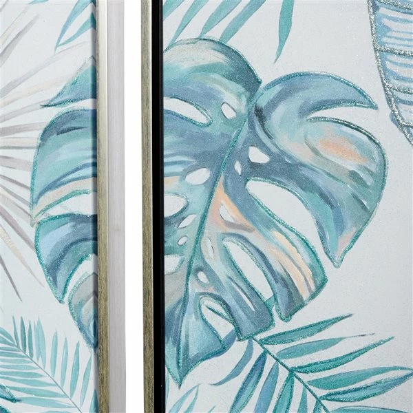 - White canvases with large palm fronds, monsteras, and other large leaves painted in light aqua, blue, green, and turquoise with hints of pale pink