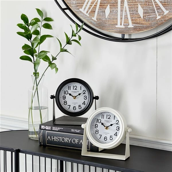 - Classic black and white round table clocks