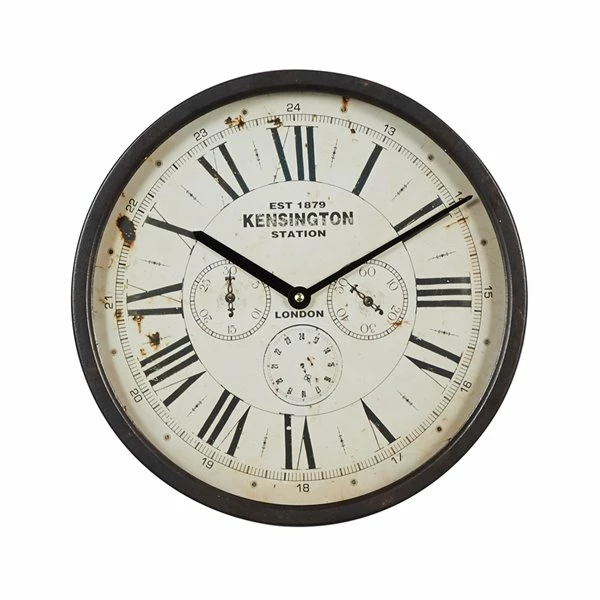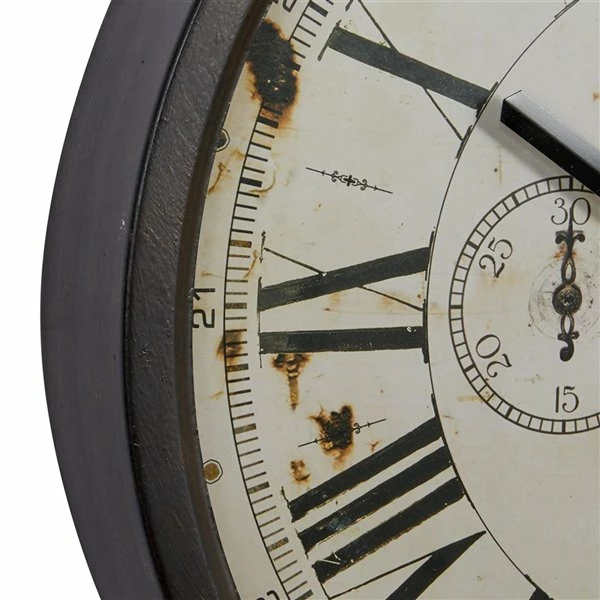 - Matte brownish-black finish over housing, distressed clock face with Roman numerals and smaller dials