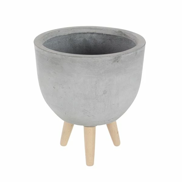- A muted soft grey planters with matte finish and a light natural brown legs