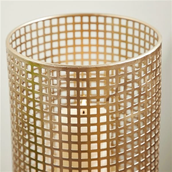 - Solid metallic gold iron, clean lines, and mesh sides create a very industrial look to these glass and metal candle holders