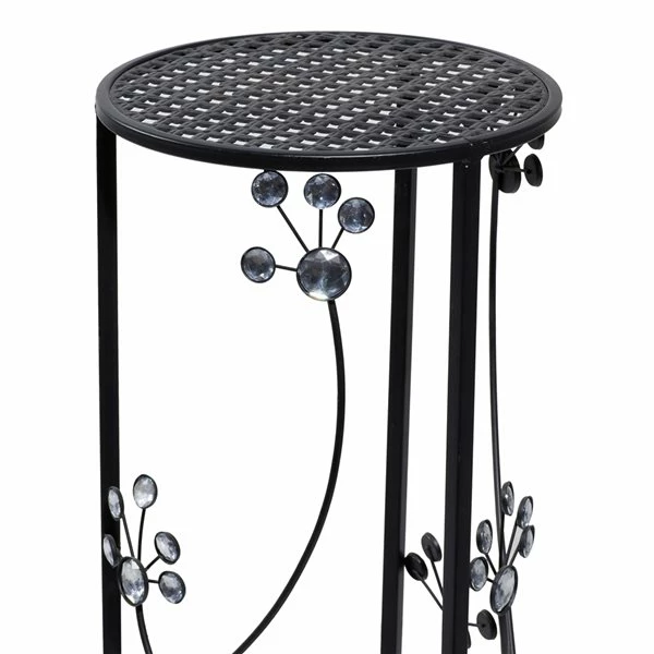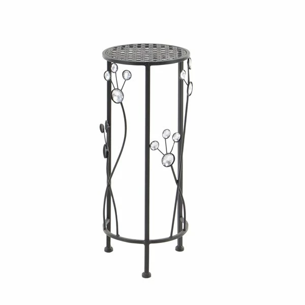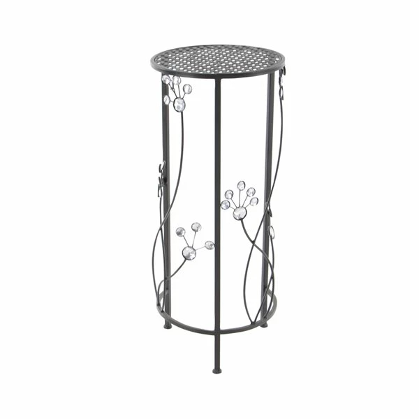 - An open waffle grid top, tall cylinder shapes, and decorative iron vines with clear acrylic crystal flowers