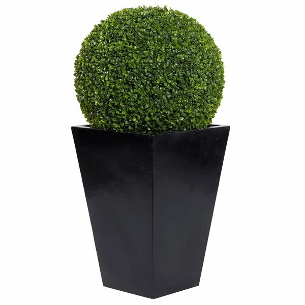 - This plastic topiary has a smooth green finish and a glossy black planter